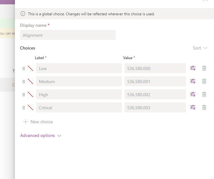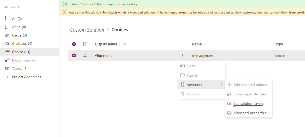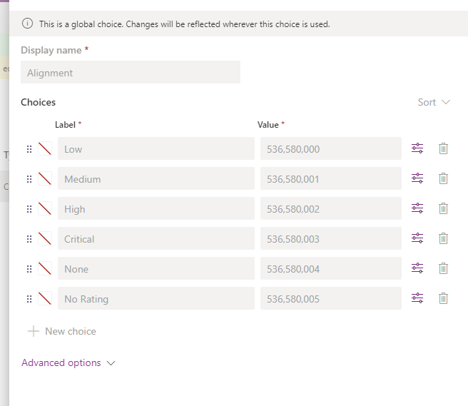 Example : Dev environment has a solution named “Custom Solution” and one choice named “Alignment”. It has the following choice options in it.
